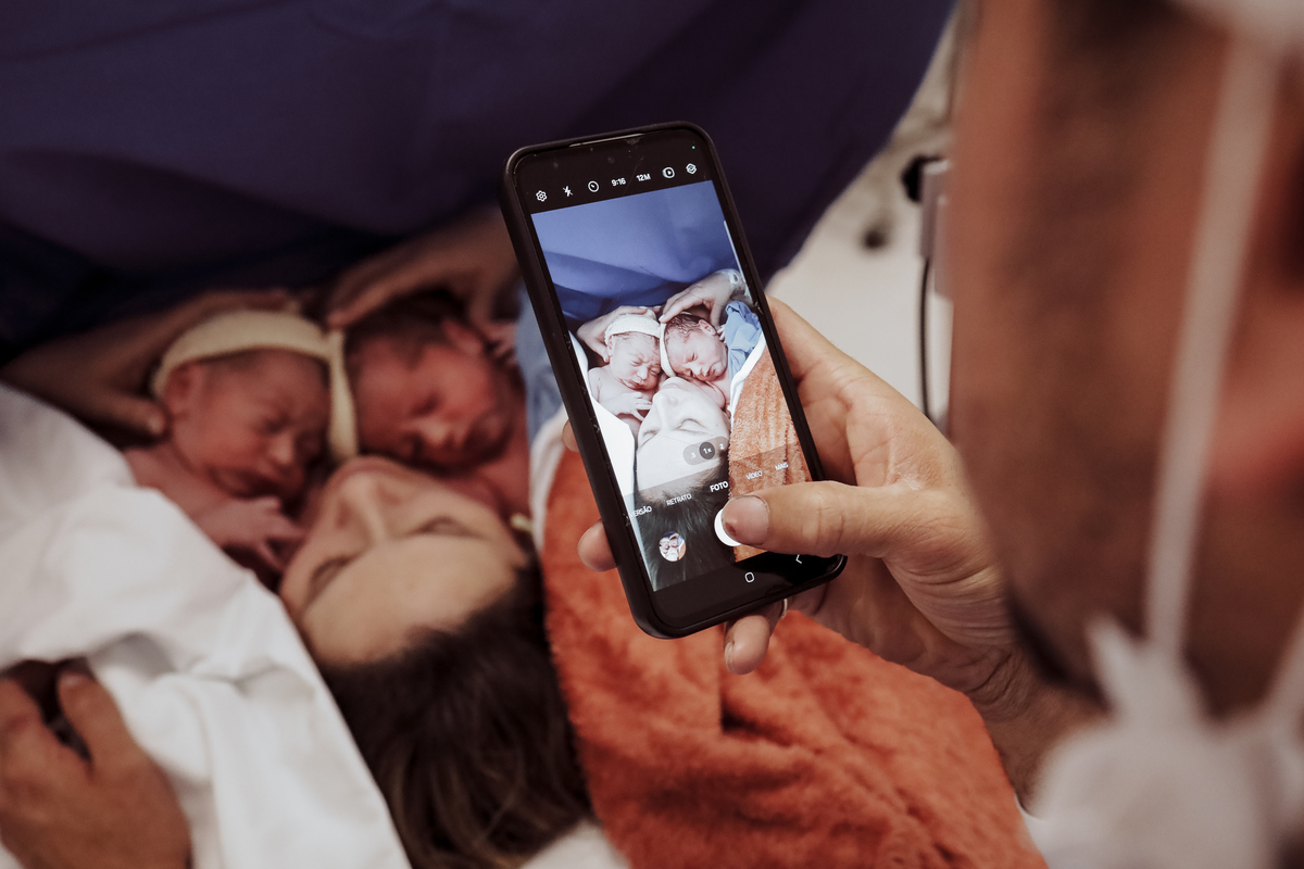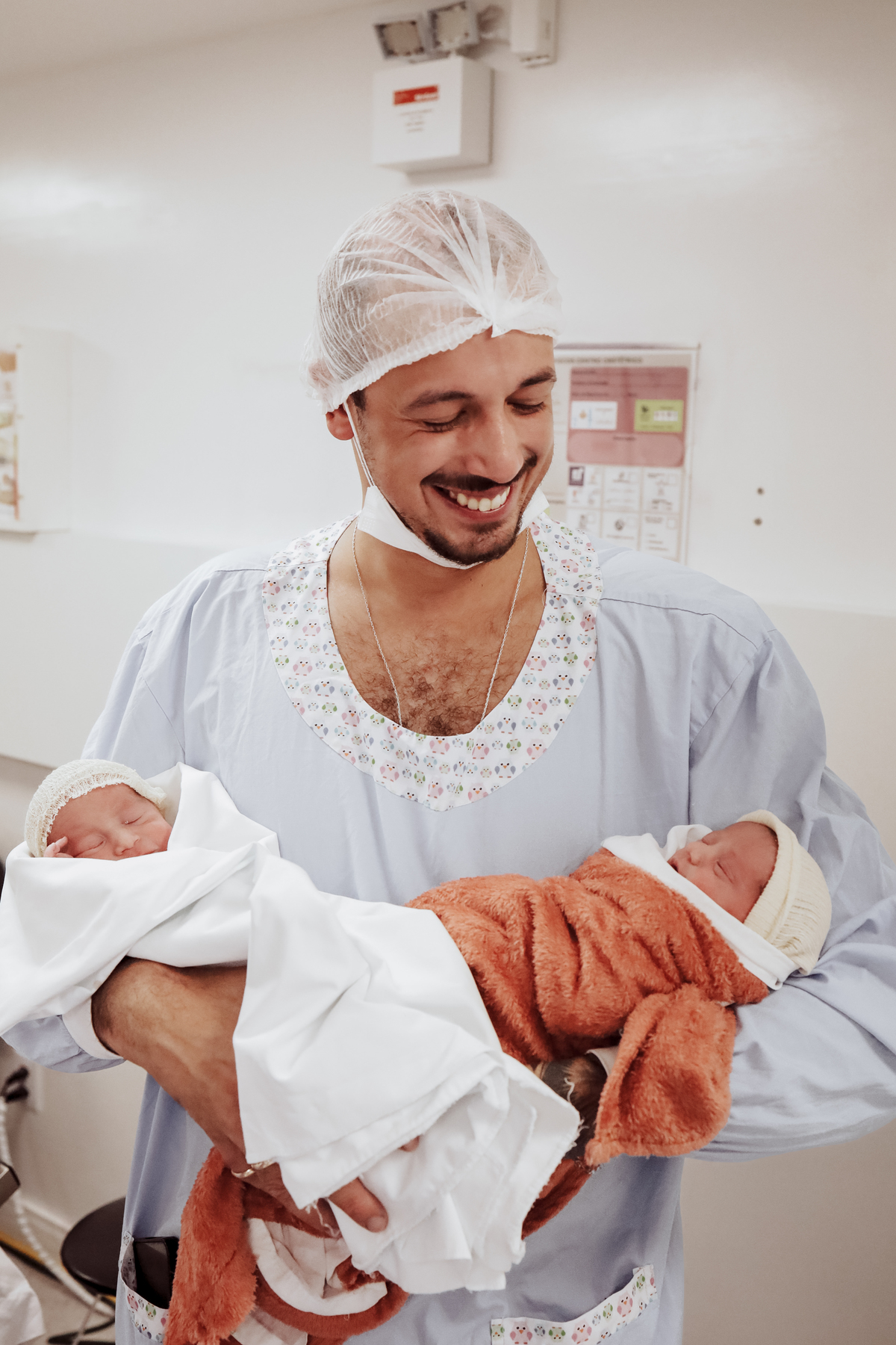 Dois bebês lindos, cercados de amor, aconchego e emoção. O pai, entregue, com os olhos marejados.